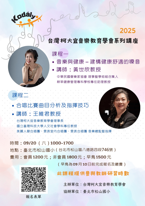 9/20(六)在臺北市松山國小,一天雙重收穫!上午由 黃世欣教授 帶來《音樂與健康-建構健康舒適的嗓音》,學習如何維護與運用聲音;下午由 王維君教授 分享《合唱比賽曲目分析及指揮技巧》,讓你掌握舞台與教學實戰力。